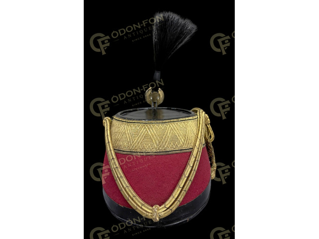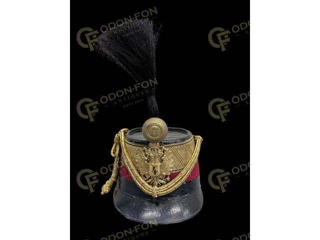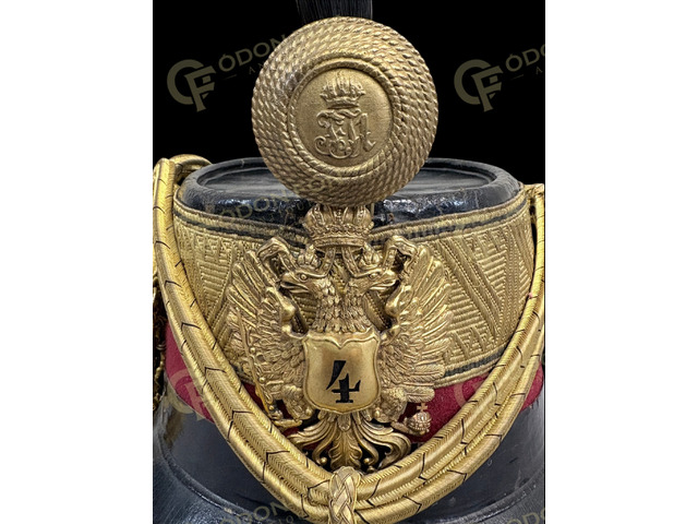 1868 M K.u.K. Husarenoffiziers-Tschako. 4. Regiment (Sopron): zwischen 1868–1918. Leder, mit rotem Tuchbezug und schwarz gewebtem goldenem Posamentenband (Leutnant–Oberleutnant Rang), mit Verschnürung. Vorne mittig der mit Krone verzierte österreichische kaiserliche Adler sowie ein Messing-Federhalter, verziert mit dem Monogramm des 4. Husarenregiments und von Kaiser Franz Joseph I., Kaiser von Österreich und König von Ungarn. Dem Alter entsprechend in ausgezeichnetem Zustand. Original, in schönem Zustand.