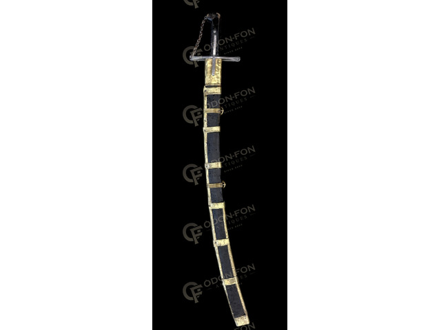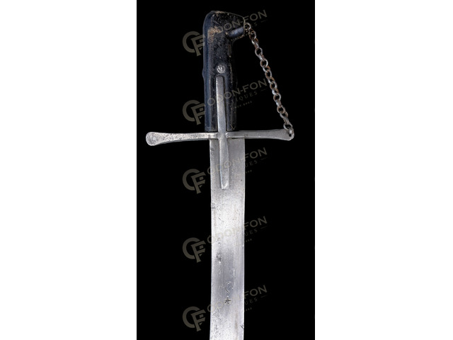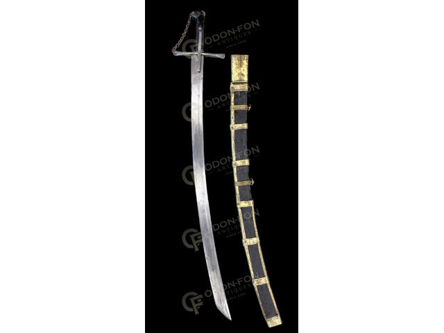 17. sz. második fele. Enyhén íves acélpengéje fokéles, foka alatt egy hosszanti vájattal, melyen beütött készítői ötágú csillag és holdsarló jeggyel. Lapított végű keresztvassal, láncos kézvédővel. Bőrözött, ujjtámaszos markolat végén megtörő, enyhén előre álló, egyenesen levágott henger alakú kupakkal. Magyaros ízlésvilágú, kalapált, réz szerelékes, bőrrel bevont fa hüvelyén 2 db felkötőpánttal, hüvely vége lapított saruverettel záródik. Szép, eredeti állapotában.