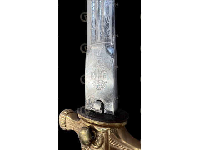 Német aranyozott tőr kópia: Solingen, E & F Hörster márkájú, maratott pengével. Szép állapotban.