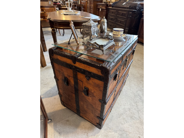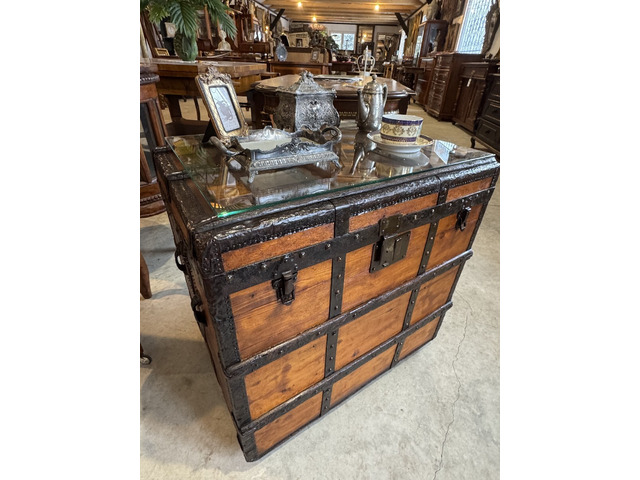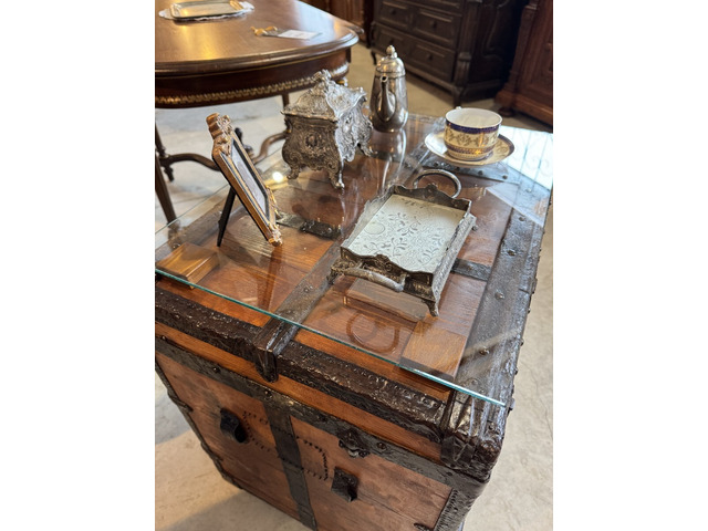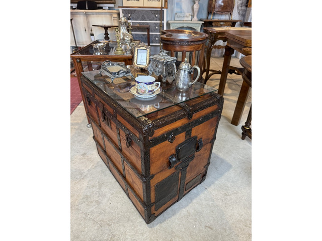 Frissen felújított, restaurált, kézi politúrozású utazó láda, dohányzó asztal.