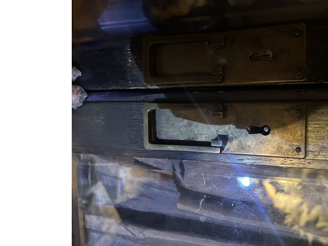 Középen kétszárnyú üveges rész osztott üvegezéssel, alul zárt tároló, oldalt díszített panelek. Eredeti vasalatokkal. Felújításra szorul. A baloldali üveges elemek 3/4 része megvan.
