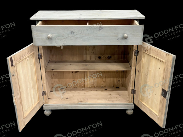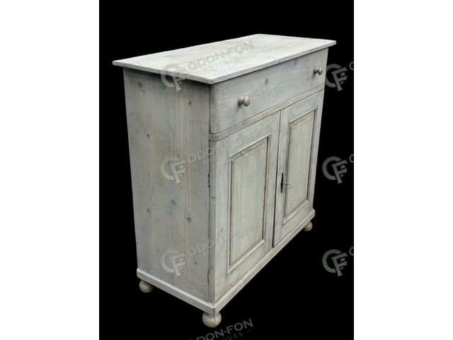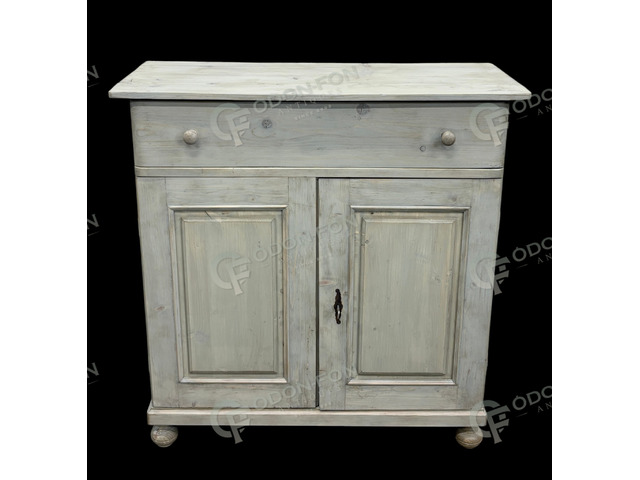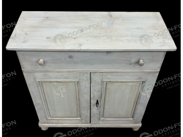 Grey base cabinet with washed paint finish: Around 1930–40. Pinewood. With waxed surface finish. In restored condition. With key and working lock.