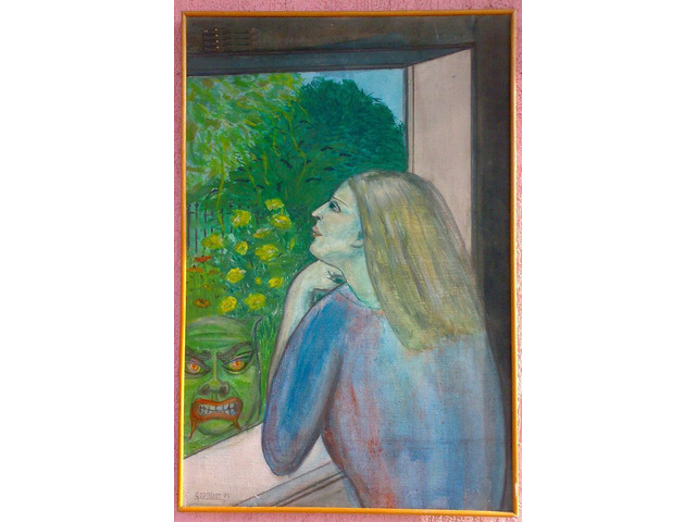 44.900 Ft Modern Expresszionista festmény. Sara Godthart: Ablakon kitekintő nő Tiszaföldvár