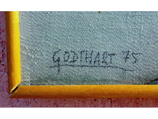 Feketére alapozott vászonra készült. Szignálva jobbra lent GODTHART 75.