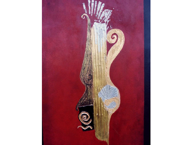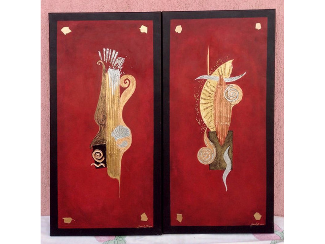 Minden apró megnyilvánulása a festő mester munkáját, látásmódját dicséri. A bordó, fekete, ezüst, és az arany árnyalatainak látványos összhangban megkomponált antik Görög-Római hatású világában összeálló két darab azonos méretű egységet alkotó kreációban. Olaj-vászon festmény, hangsúlyos pasztell színekkel, szignálva a kép jobb oldalán alul (Gabriele Eh. 8/10). Hangsúlyos színei, és a témájánál fogva, vonzza a tekintetet, és kiemelkedően megszépíti a lakásod, vagy bármely vendéglő, közösségi épület enteriőrjét. Ajándékozási célból kiváló választás.