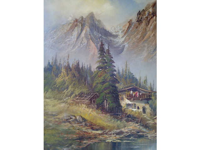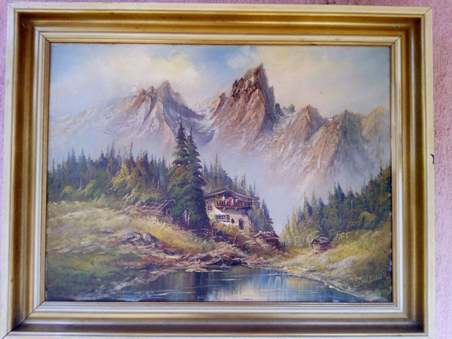 65.000 Ft Patak a déli dolomitoknál, romantikus tájkép Németországból olaj-vászon szignálva, keretezve Tiszaföldvár