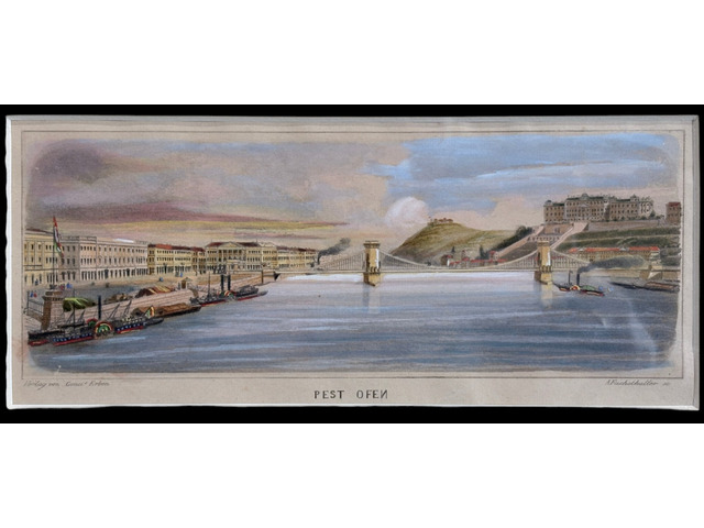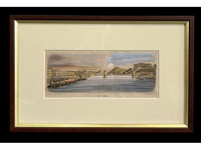 FUCHSTHALLER Alajos – Pest és Buda lánchíddal: 1855 körül. Gonci & Erben. Gyönyörű színezésű acélmetszet. Paszpartuzva, keretben.