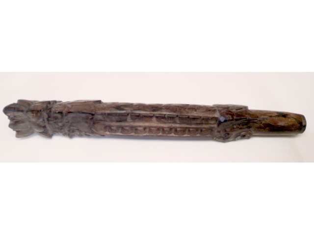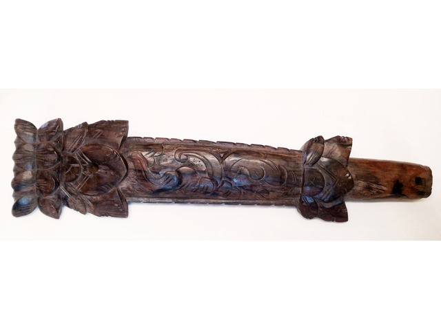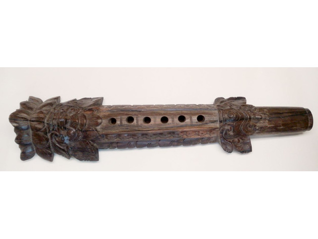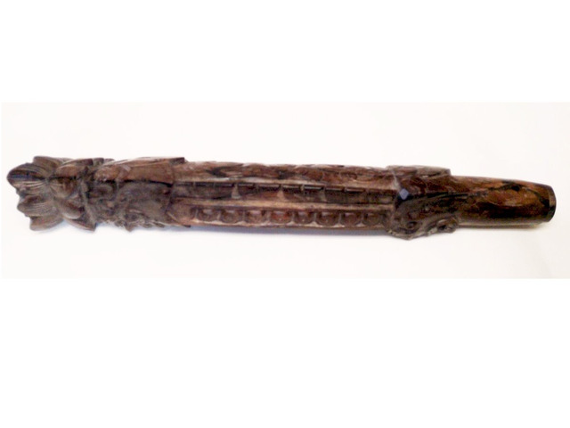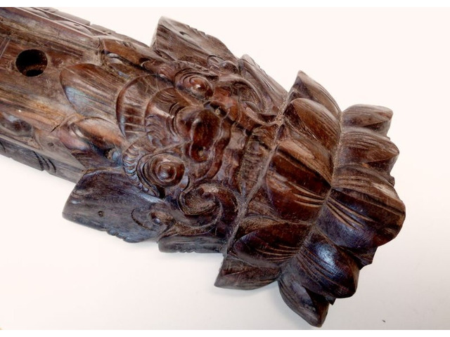 Kemény fából készült, valószínűleg paliszander. Mind a két oldalán mintázott 7 lyukas fuvola. Sajnos a felső részéről hiányzik egy pici bambusz gyűrű, amelyen át kell megfújni a hangkeltéshez. Egyszerűen pótolható. A képen látható szép, patinás állapotban postázom, a hanggyűrű pótlását követően használható, vagy kiállítható.