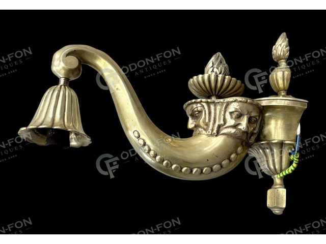 Wandleuchte mit menschlichem Kopfdekor: Um 1910–20. Gegossenes Messing, gereinigt, guter Zustand.