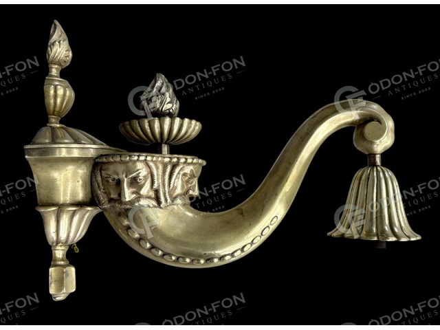 Wall sconce with human head decoration: Around 1910–20. Cast brass, cleaned, in good condition.