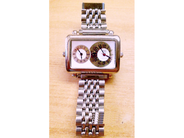 Kiváló állapotban lévő használt női karóra, két zónás kijelzővel, fém szíjjal.