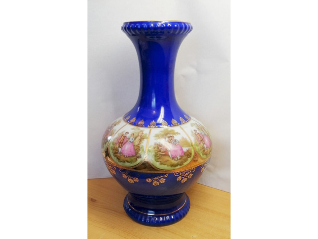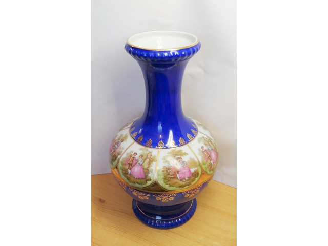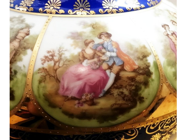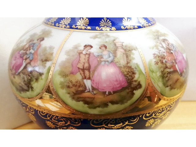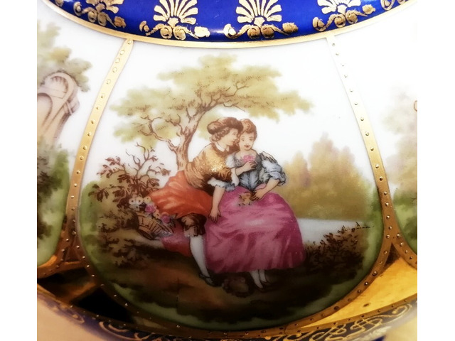 Rendkívüli szépségű kobaltkék alapszínű porcelán váza, dús aranyozással, körben különböző romantikus jelenetekkel díszítve.