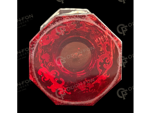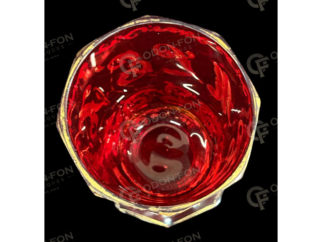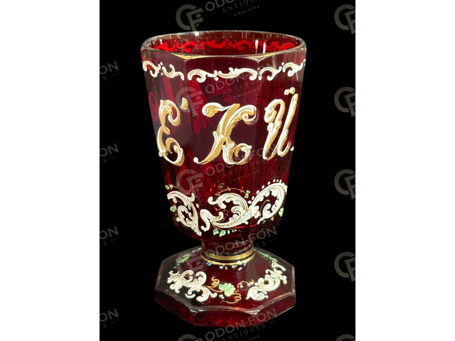 „Emlékül” feliratos biedermeier talpas kehely: 1850 körüli. Bíbor pácolt, csiszolt, fújt üveg. Zománcfestett felirattal, barokkos motívumokkal, aranyozással. Jó állapotban, azonban peremén enyhén kopott aranyozással.