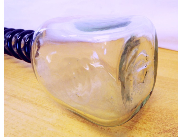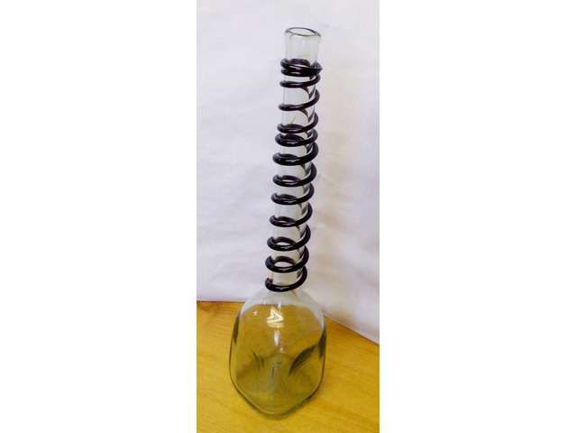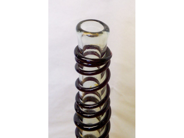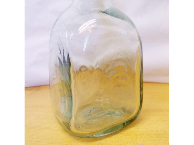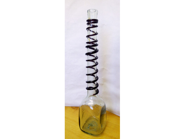 Valamikor az 1880-1910-es években készülhetett. Hibátlan állapotban van, horpasztott oldalakkal, spirál alakban a nyakára tekert üvegzsinórral. Jellegzetes bugyborékoló hangot ad az ital kitöltésekor. A képen látható szép, patinás állapotban postázom, akár azonnal használatba vehető, vagy kiállítható.
