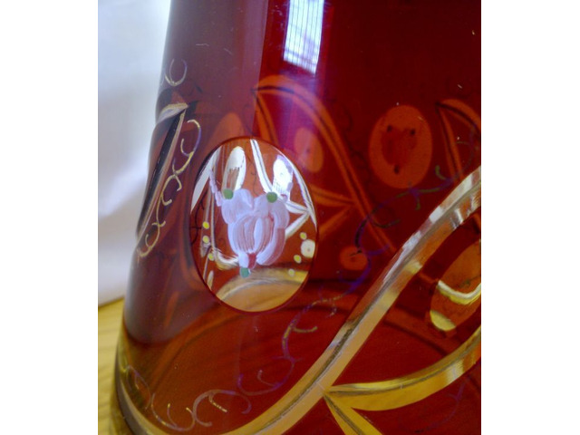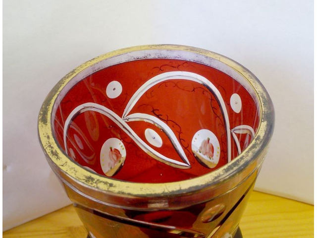 Kézi munkával készült, nagy méretű, aranyozott szájú, és nagyon finom, hajszál vékony indás aranyozással, valamint apró rózsás festéssel díszített biedermeier rubin színben pompázó öblös testű váza, aprólékosan kidolgozott művészi munka.