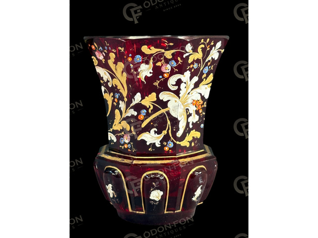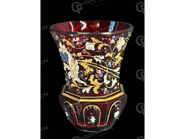Biedermeier pohár: 1850 körüli. Rubin színű csiszolt, fújt üveg. Zománcfestett színes és arany ornamentális díszítéssel, aranyozással. Jó állapotban, azonban peremén enyhén kopott aranyozással.