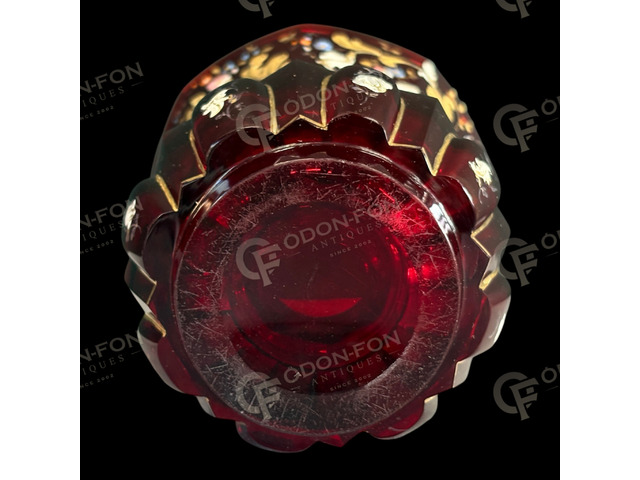 Biedermeier glass: Around 1850. Ruby-colored cut, blown glass. Enamel-painted multicolored and gold ornamental decoration with gilding. In good condition, with slightly worn gilding on the rim.