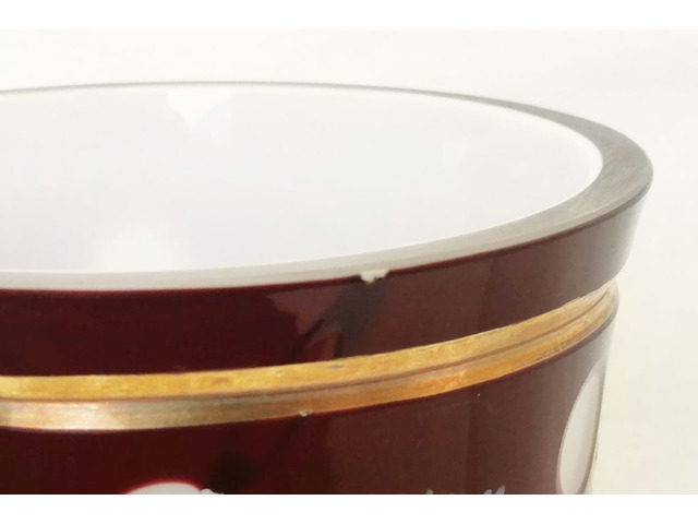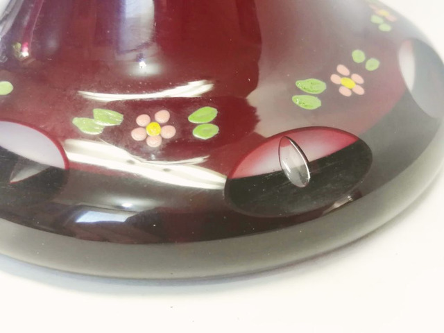 Több rétegű üvegből készült, metszett medalion forma dekoráció. Gyönyörű bordó színű alapozással, aranyozva, virágdíszítéssel.
