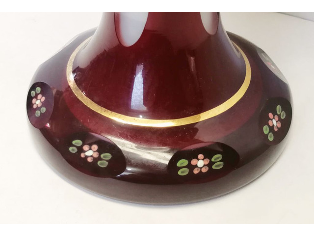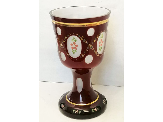 Kézi festéssel készült, jellegzetes medalionos, virág mintás, metszett, vastag talpas kehely.
