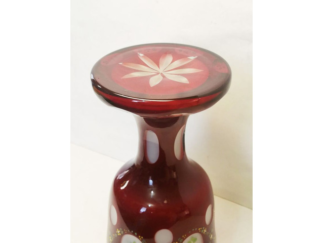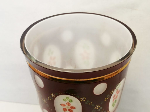 Kellemes színvilágú, a Korabeli hagyományokat őrző virágos motívumokkal, a talpán is díszes, vastag súlyos rétegelt üvegből készült pohár.