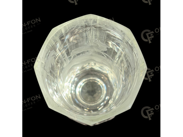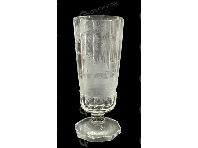 Vadász jelenetes pohár: 1850 körüli. Fazettált, fújt üveg. Oldalán reliefszerűen csiszolt vadászjelenet: kutya üldözi az őzet. Nagyon kvalitásos gravírozási munka!!!