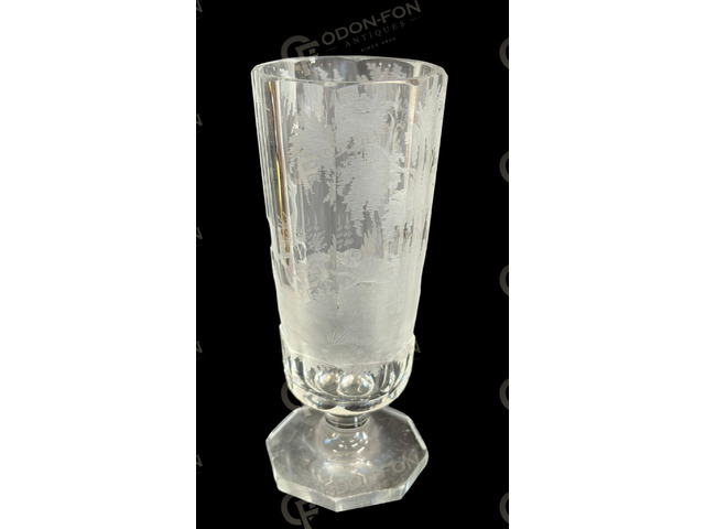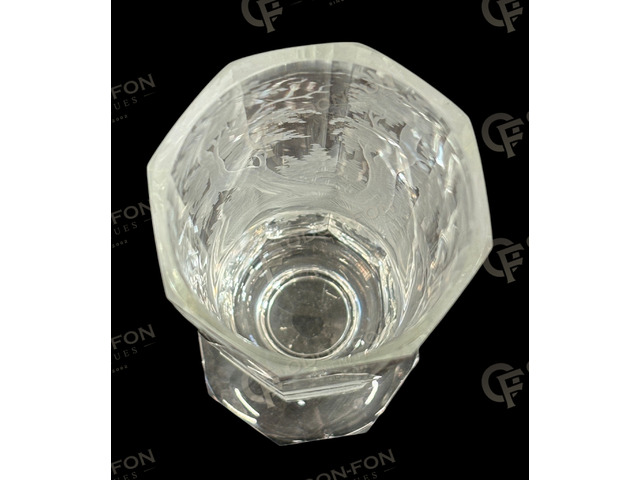 Hunting scene glass: Around 1850. Faceted, blown glass. On the side, relief-like cut hunting scene: dog chasing a deer. Very high-quality engraving work!!!