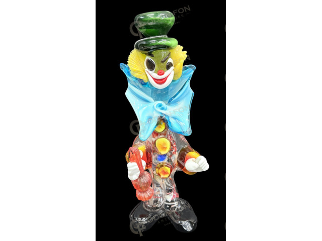 Stehende Clownfigur mit grüner Mütze – Kleinplastik: Murano, um 1980. Farbloses, gelbes, rotes, blaues und grünes, geblasenes, heiß geformtes Glas. Guter Zustand.
