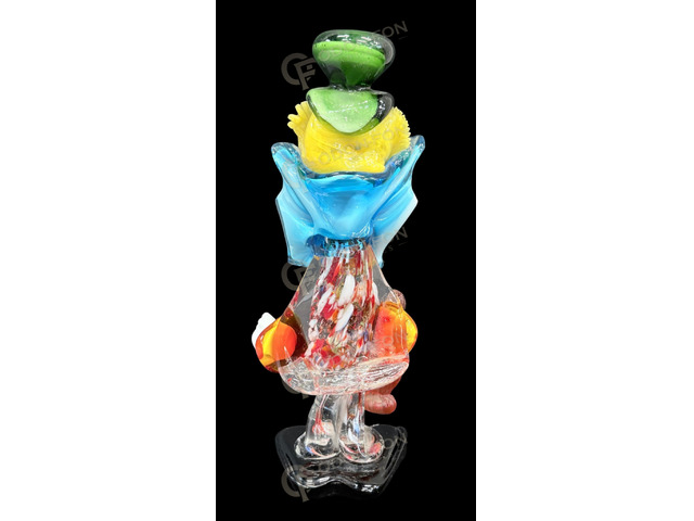 Standing clown figure with green cap – sculpture: Murano, around 1980. Colorless, yellow, red, blue and green blown, hot-shaped glass. In good condition.