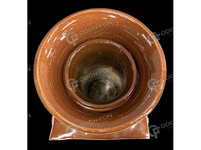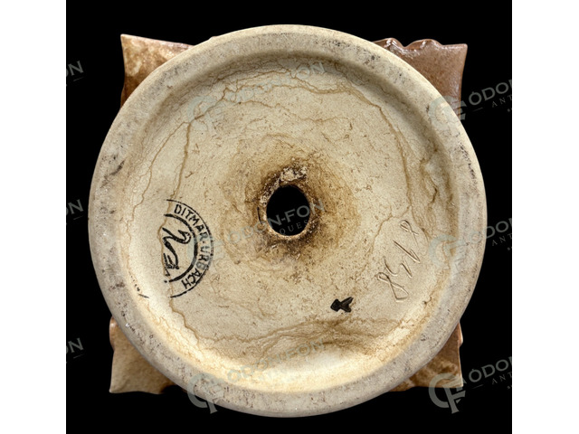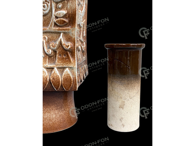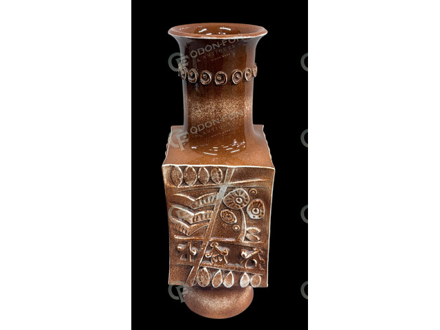 Ditmar Urbach márkájú mid-century váza: 1959 körüli. Mázas kerámia. Plasztikus, geometrikus dekorral. Jó állapotban. Víztartó betétjén korábbi javítás nyomai láthatóak. Alján karcolt 8138-as formaszámmal és a korszaknak megfelelő cégjelzéssel.