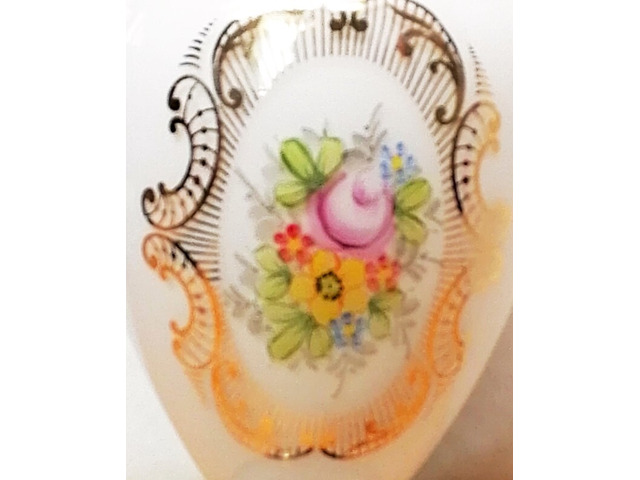 Aprólékosan kidolgozott minőségi munka. Jellegzetes a gyártóra jellemző fehér tejüveg alapszín, és az arany rokokó keretben kialakított látványos virág dekoráció.